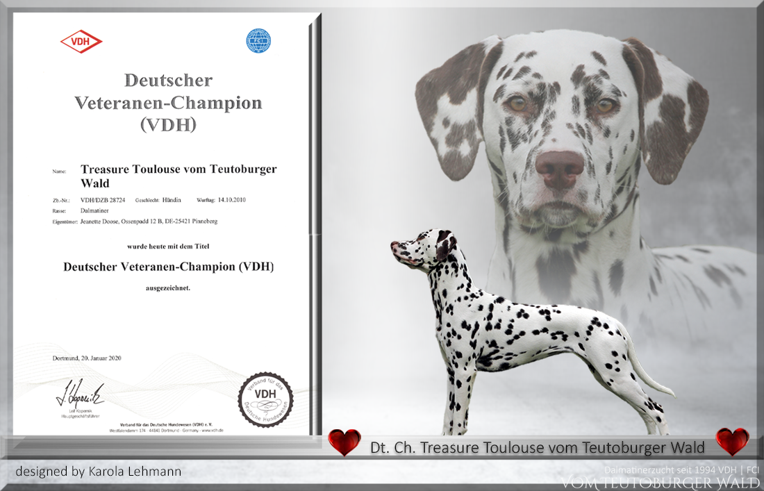 Treasure Toulouse vom Teutoburger Wald - Nachdem "Amena" in ihren 9 Lebensjahren die begehrten Titel "Deutscher Jugendchampion VDH & Club" und die stolzen Titel "Deutscher Champion VDH & Club" verliehen bekommen hat, kann sie nun auch die Titel "Deutscher Veteranen Champion VDH & Club" zu ihrer Erfolgsserie hinzufügen.